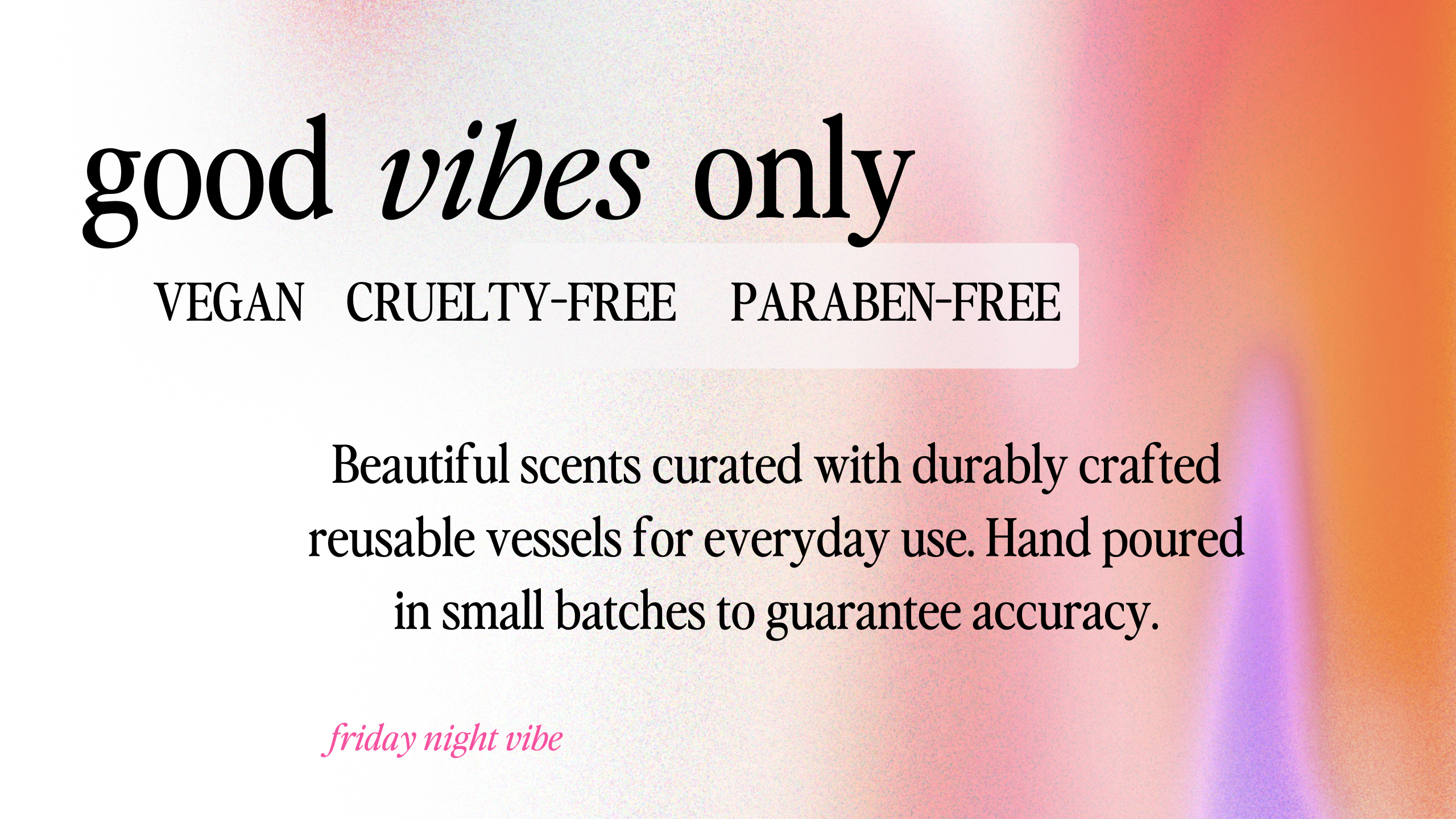 Mood evoking scents to set the vibe. Handpoured, vegan, cruelty-free, paraben and phthalate free.