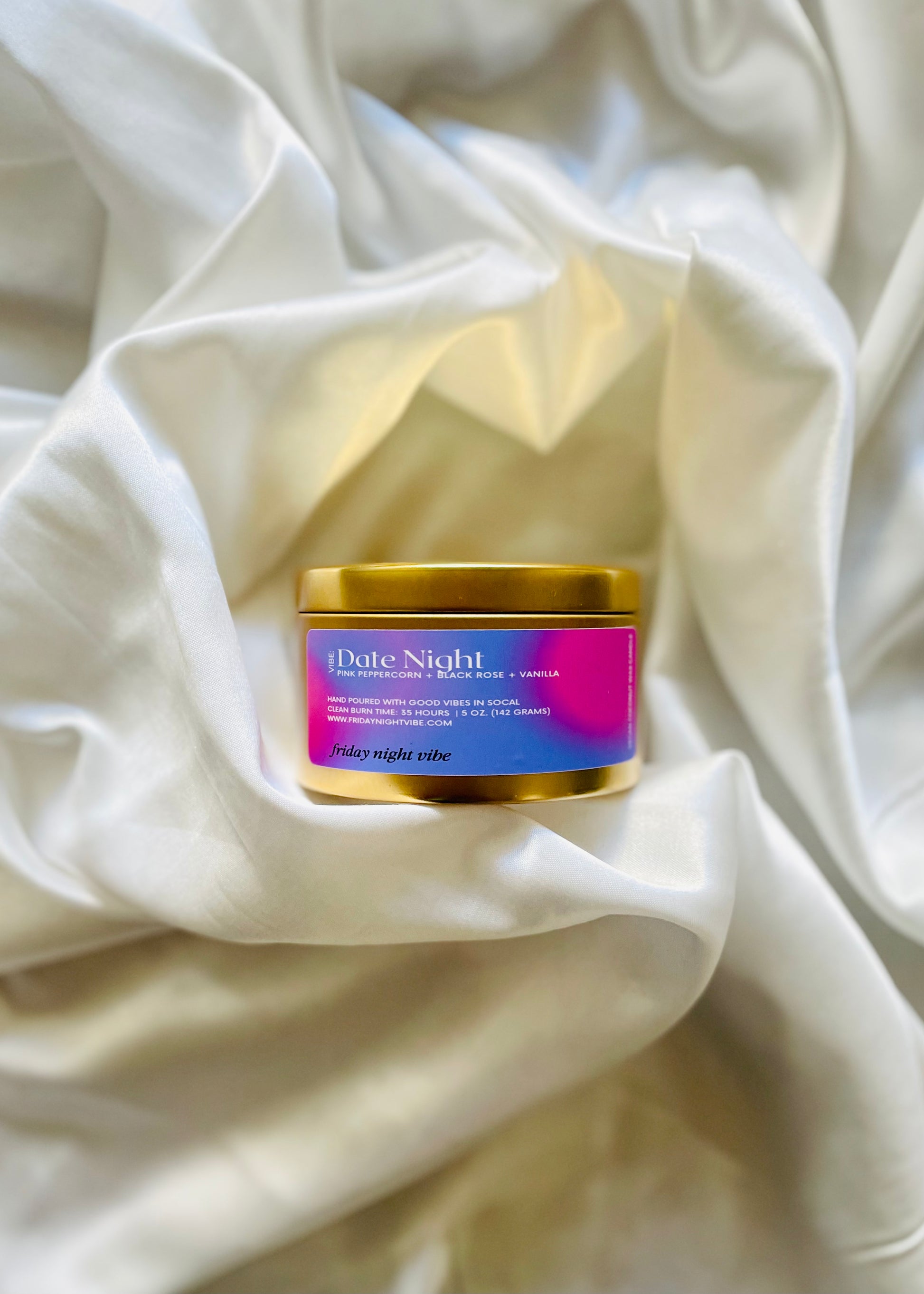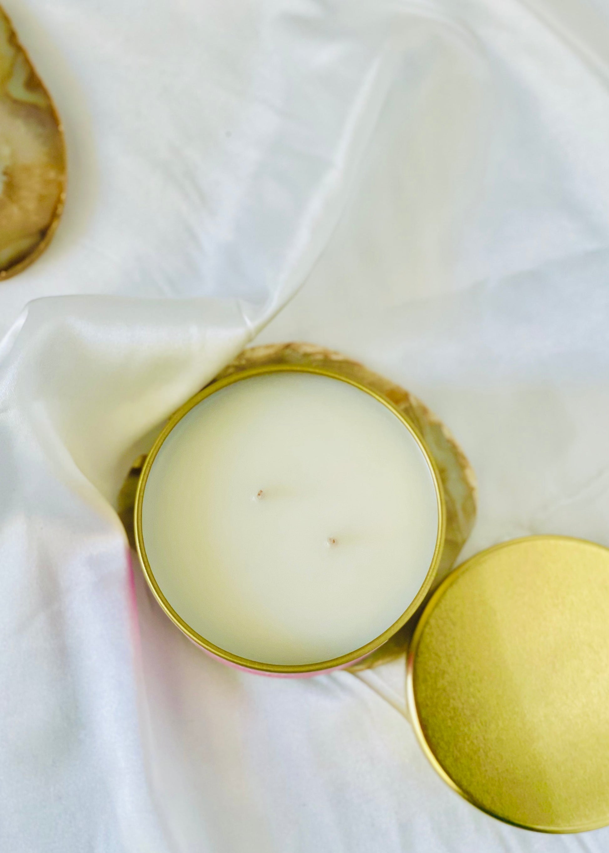 * Approximate burn time 5oz candle: 35+ hours, reusable gold tin vessel, lid included