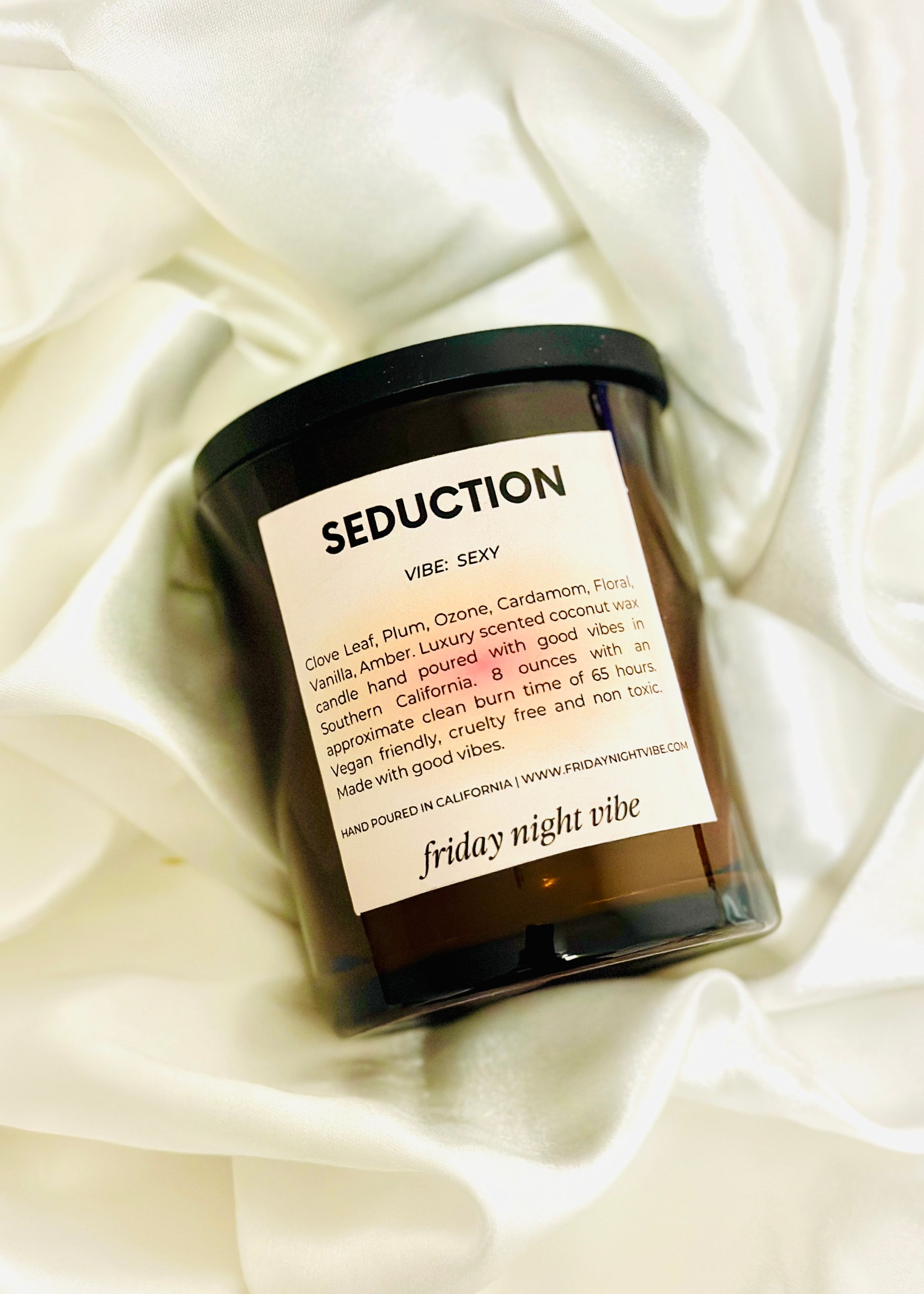 Approximate burn time 8oz candle: 65+ hours, reusable amber glass vessel, black wooden lid included
